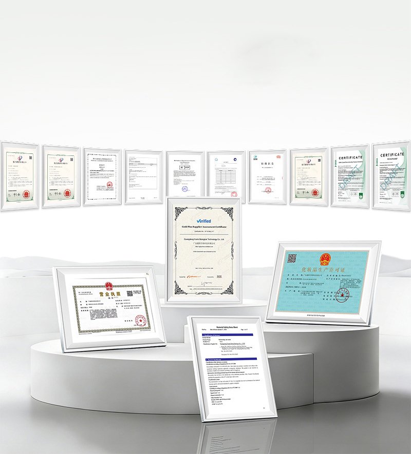FDA Certified (meeting rigorous global standards), ISO 9001 Quality Management System Certified, and ISO 22716 Certified.